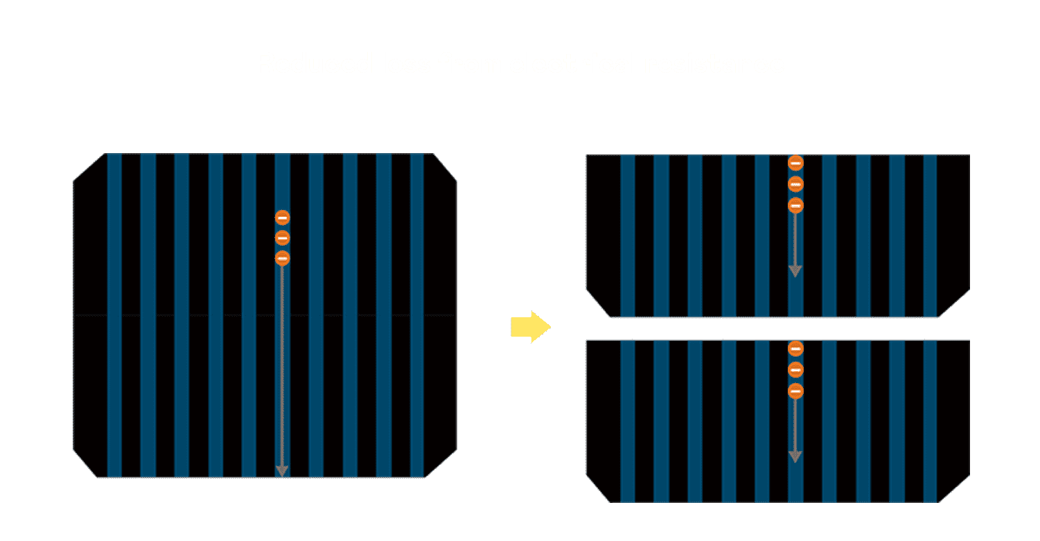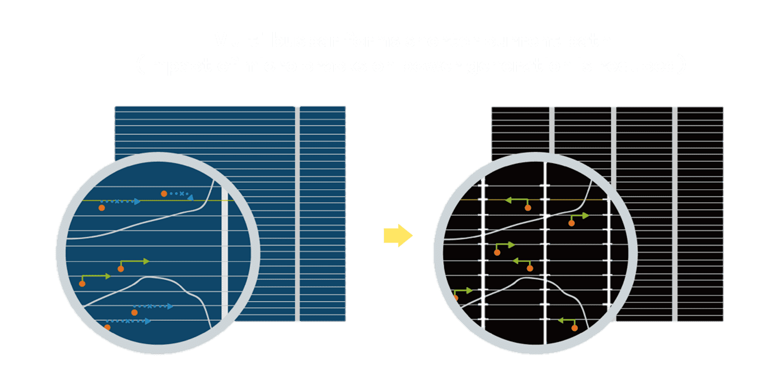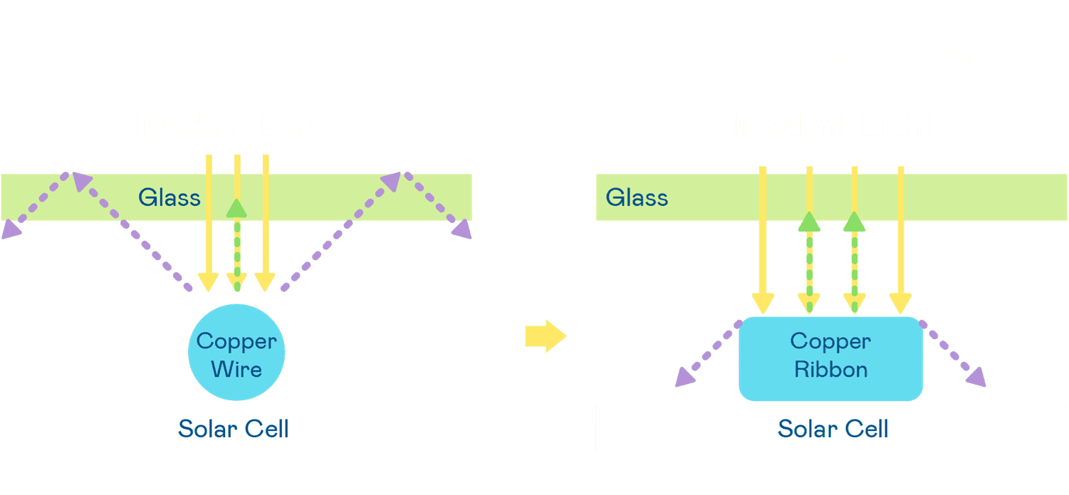 • 电池使用多条铜导线 (Copper wire) 于电池片上形成较短的电流路径,,提高电流收集效率,,,,采用圆形设计的铜导线较传统扁平式的铜焊带 (Ribbon),,可增加入射至电池的光线量。。