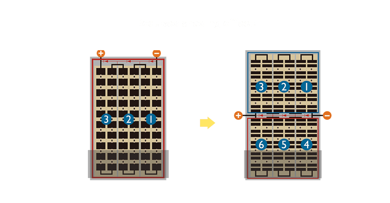 • 结合半切电池,,,,降低遮阴影响、、、提升模组抗隐裂能力、、、、并减少电阻损耗,,,,进一步提升模组发电效能。。