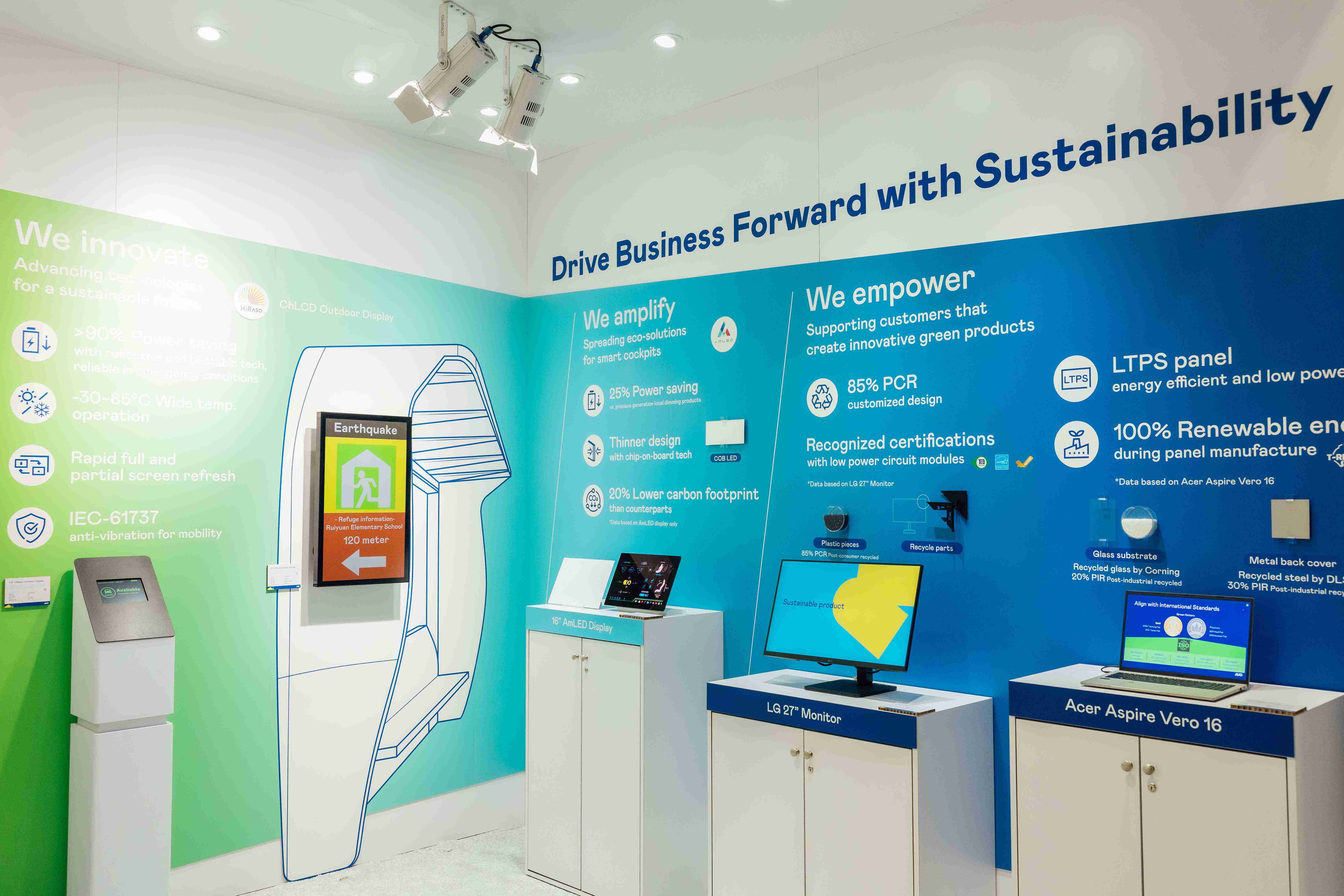 JDB电子运用创新显示技术HiRaso胆固醇液晶双稳态技术达到显示零耗能、、扩大节能省电的AmLED显示技术应用于车用产品、、以再生的消费后回收(PCR)塑料及全绿电生产之面板,,,,应用于笔电及萤幕,,,增加绿色价值。。