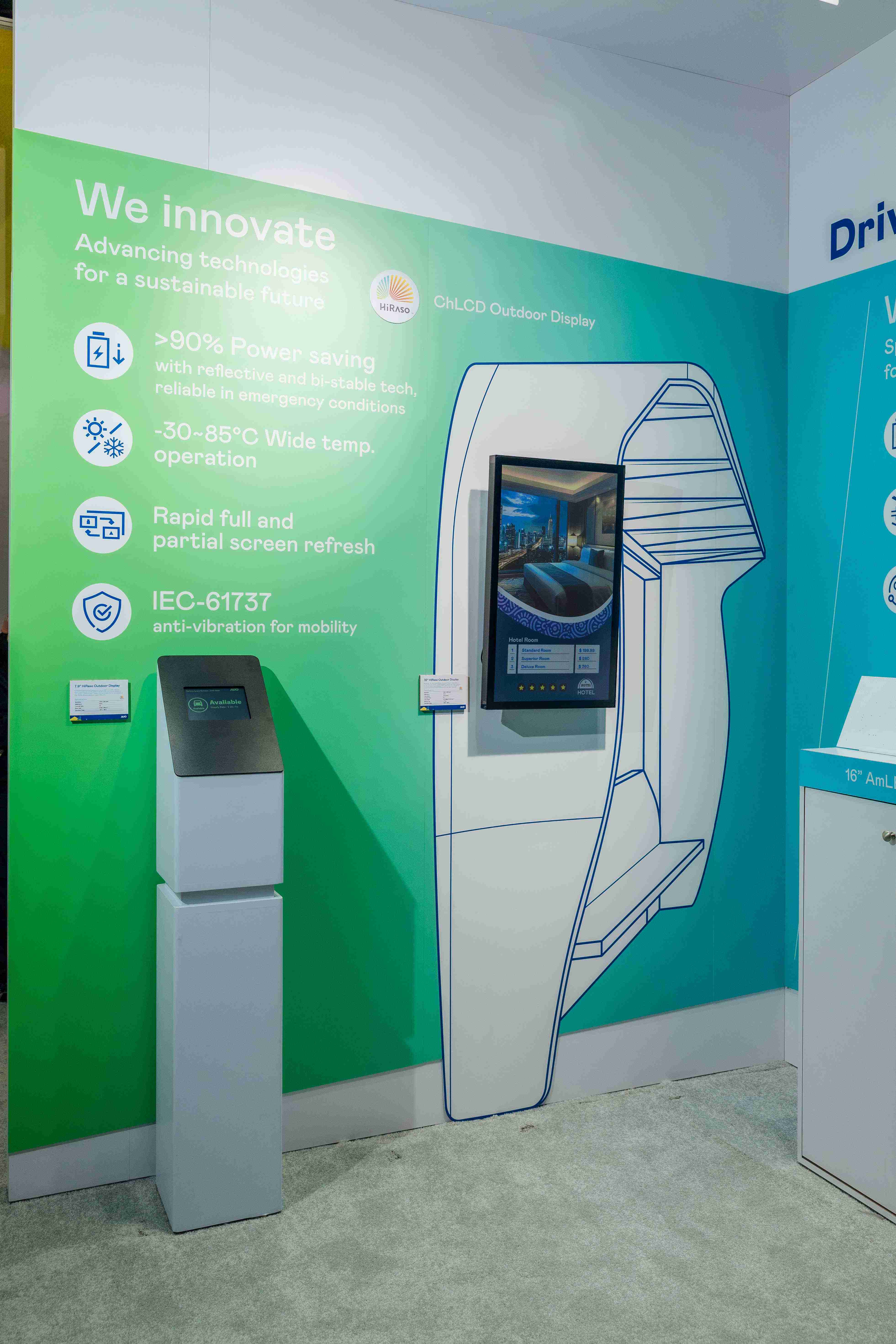 HiRaso胆固醇液晶显示器运用反射环境光线的方式,,呈现影像显示时零耗能的环保省电诉求,,光线愈强愈能呈现绝佳的色彩饱和度及显示效果,,,同时在摄氏-30度至85度间宽温的使用优势,,,为户外电子看板的新首选。。。。