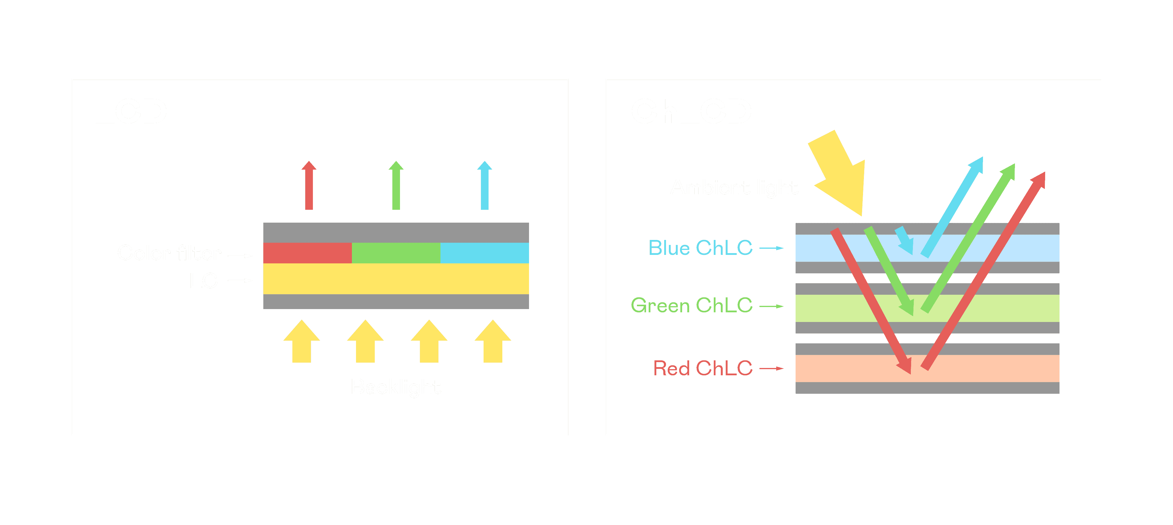 ChLCD 胆固醇液晶就如同纸张一样,,,透过反射环境光来显示影像,,因此长时间观看不易造成人眼视觉疲劳,,,可达到护眼效果。。。当处于户外阳光下使用,,,LCD 影像容易失真而不易观看,,,,但胆固醇液晶仍可维持较佳的影像品质。。。。