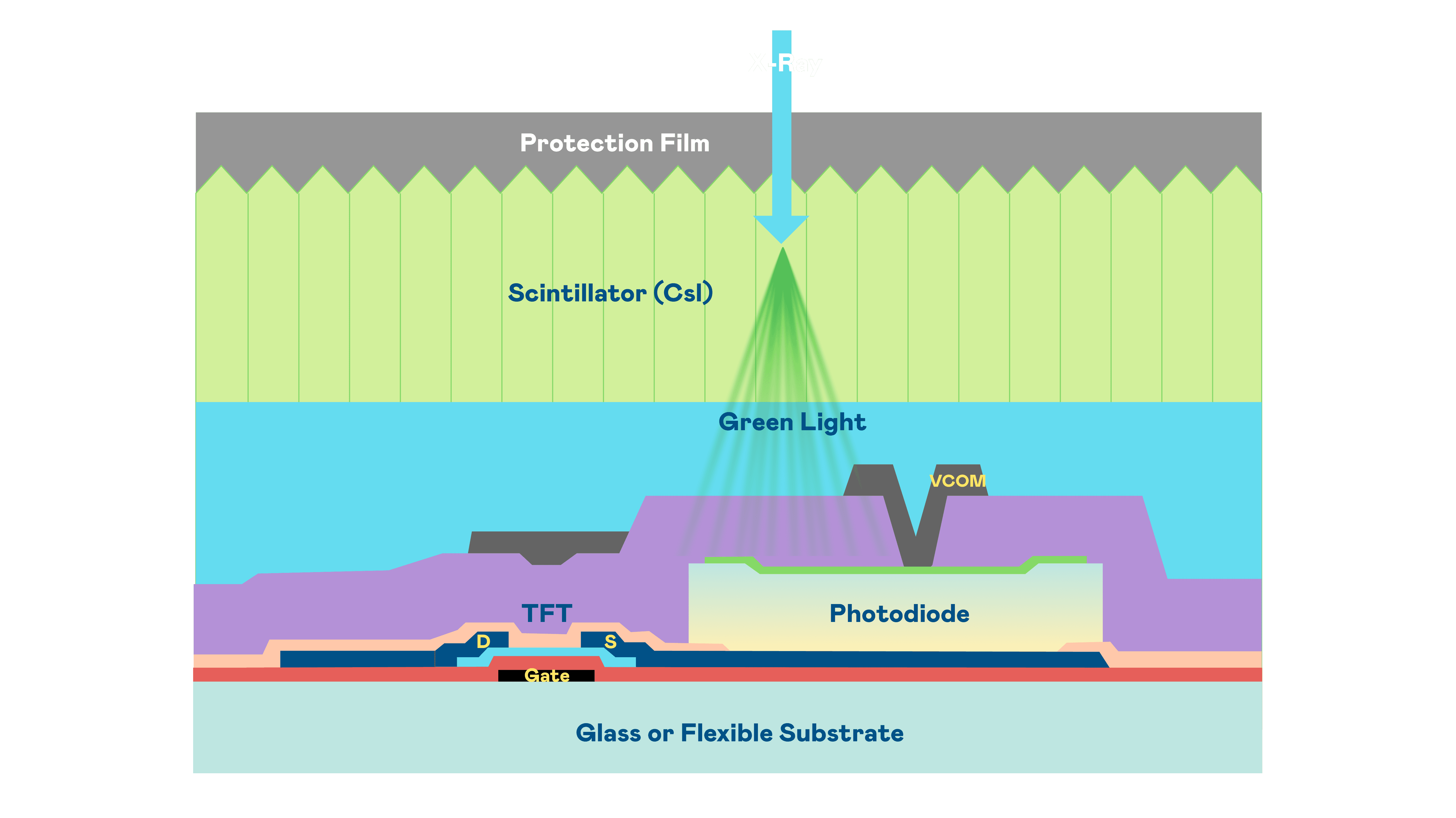 JDB电子的X光影像感测阵列使用薄膜电晶体 (TFT) 作为每个像素的读取开关,,搭配光电二极体(Photodiode)的光电转换元件,,,,用以感测X光影像讯号。。